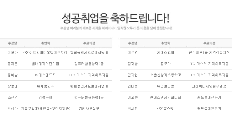 하이미디어컴퓨터학원 노원캠퍼스 2015년 3월 성공취업자 명단입니다.